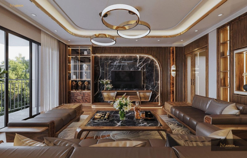 Gỗ luôn là vật liệu “vua” trong thiết kế nội thất. Phòng khách gỗ mang đến vẻ đẹp sang trọng, bền bỉ và ấm cúng. Gỗ óc chó, sồi hoặc gỗ lim là những lựa chọn được ưa chuộng nhờ độ bền và màu sắc tự nhiên.