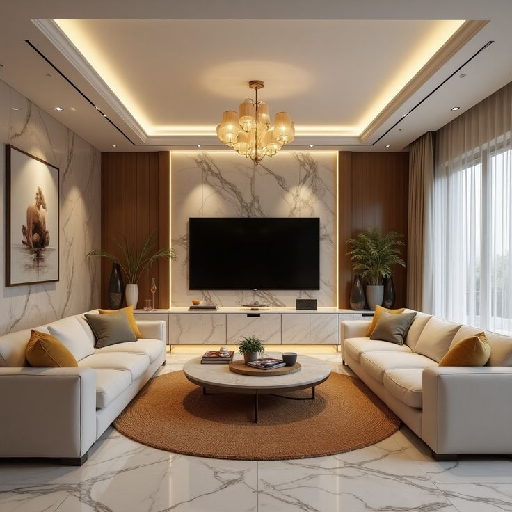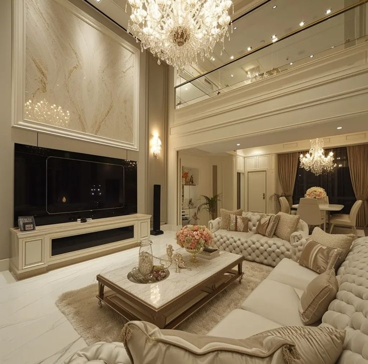 Phòng khách Luxury sử dụng vật liệu cao cấp như đá marble, kính, kim loại ánh vàng cùng ánh sáng tinh tế. Thiết kế này tạo nên không gian xa hoa, phù hợp với biệt thự hoặc căn hộ cao cấp.