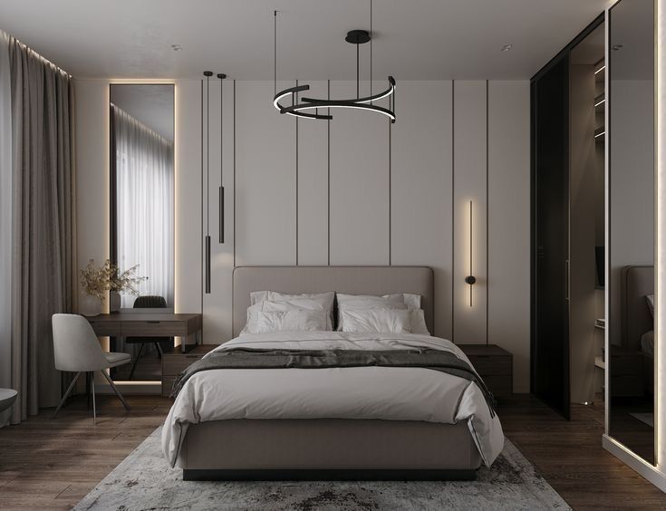 Phòng ngủ được thiết kế với gam màu trung tính như trắng, đen, xám, và màu be đất,.. tạo được chiều sâu và sự hài hoà cho không gian phòng ngủ.