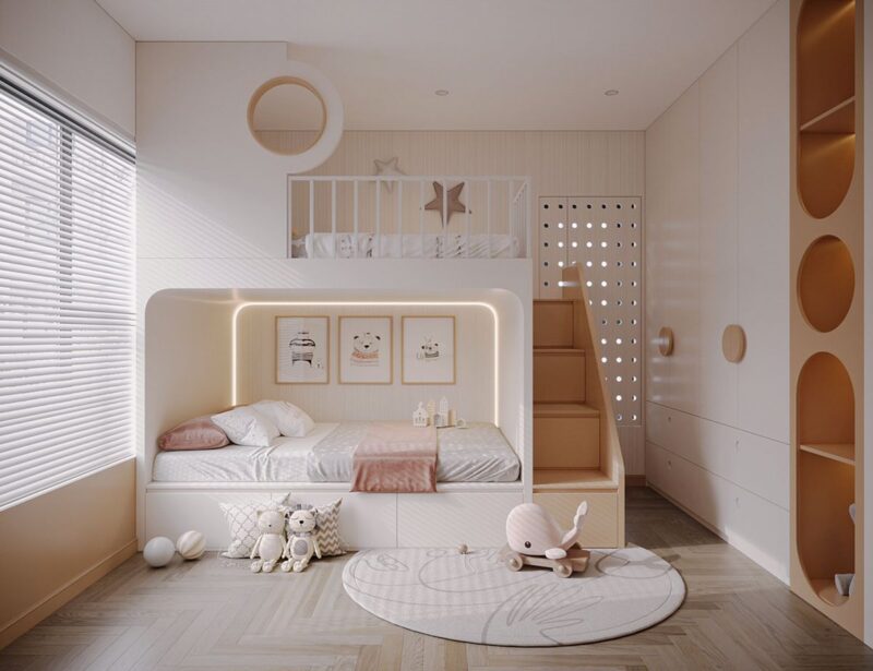 - Tối ưu công năng và không gian sống: Việc thiết kế nội thất thông minh, hợp lý và tối ưu hoá công năng, diện tích sẽ giúp mang lại không gian sinh hoạt tiện nghi, gọn gàng tạo thói quen ngăn nắp cho bé ngay từ nhỏ