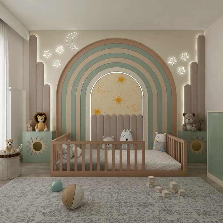 Ở lứa tuổi này bé phải phát triển về nhận thức và ngôn ngữ do đó bé cần không gian an toàn tránh góc nhọn và ưu tiên giường thấp. Trang trí các bảng màu sắc bắt mắt tươi sáng và sinh động tạo sự thích thú cho bé.