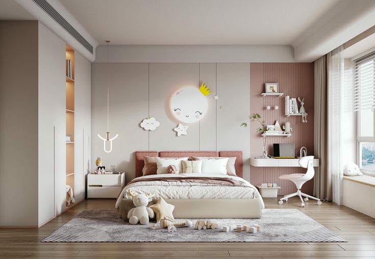 Thiết kế phòng bé gái năng động, cá tính thường sử dụng những gam màu trung tính như trắng, xám, hồng pastel tạo nên một phong cách riêng biệt đơn giản và không quá cầu kì. Đối với phòng ngủ bé gái có thể trang trí bằng các bức tranh treo tường, hoạt hình hay các tấm poster nghệ thuật đơn giản nhưng rất có gu.