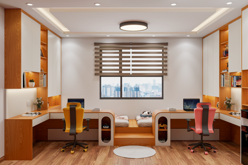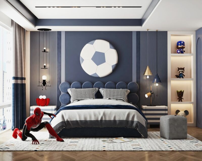 Phòng ngủ cho bé trai tập trung vào sự năng động, cá tính và tính an toàn cau, tích hợp khu vực học tập và vui chơi. Sử dụng các màu sắc tươi sáng như xanh dương, xanh lá cây, cam hoặc các chủ đề yêu thích như phi hành gia, thể thao, siêu nhân anh hùng,.. Phòng cho bé nên ưu tiên nội thất đa năng như giường tầng có cầu trượt, bàn học tích hợp giá sách và khu vực lưu trữ mỡ dễ dàng cất đồ chơi cho bé. Đảm bảo ánh sáng tự nhiên, vật liệu bền bỉ và góc bo tròn để tạo không gian an toàn, kích thích sự sáng tạo cho bé.