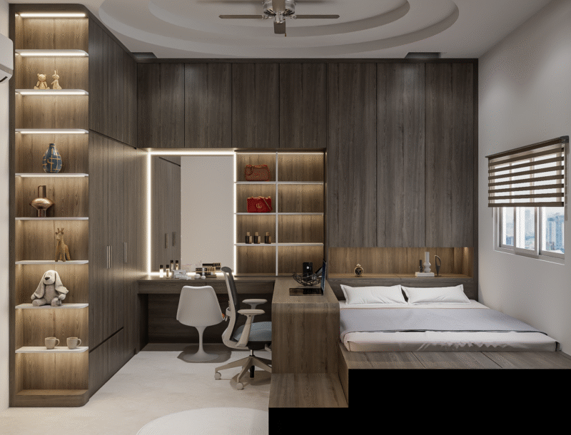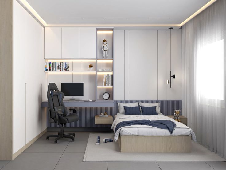 Phòng ngủ được thiết kế thông minh tâp trung vào sự tối ưu hoá không gian bằng cách tích hợp công nghệ và chất năng đa nhiệm. Sử dụng các dạng nội thất gọn hoặc ẩn như giường âm tường và bành làm việc có thể kéo ra, thu vào tiện lợi và tiết kiệm diện tích. Hệ thống tủ lưu trữ âm tường kịch trần và giường có ngăn kéo giúp loại bỏ sự bừa bộn, giải phòng sàn nhà tối đa. Tích hợp hệ điều khiển thông minh như ánh sáng, rèm, nhiệt độ để nâng cao tiện nghi sống cho không gian.
