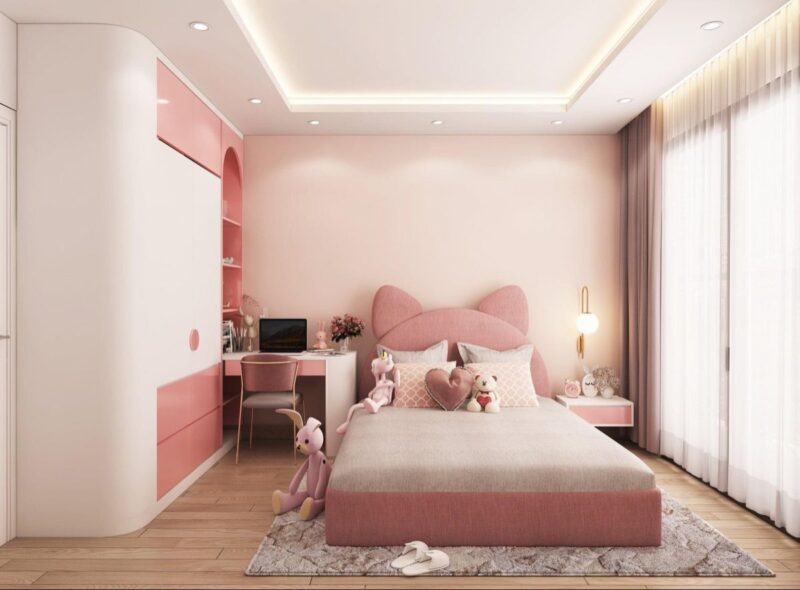 Mẫu phòng ngủ này kết hợp sự dịu dàng, mơ mộng công chúa với những đường nét hiện đại và tinh tế. Phòng ngủ cho bé gái tập trung vào gam màu pastel như hồng nhạt, tím lavender và trắng kem tạo nên một không gian nhẹ nhàng và ấm áp. Các món đồ nội thất đa năng, trang trí bằng các chi tiết lấp lánh hoạ tiết hoa lá tăng tính sáng tạo và nữ tính cho bé. Đây là một không gian vừa đẹp mắt, an toàn vừa kích thích trí tưởng tượng cho bé gái.
