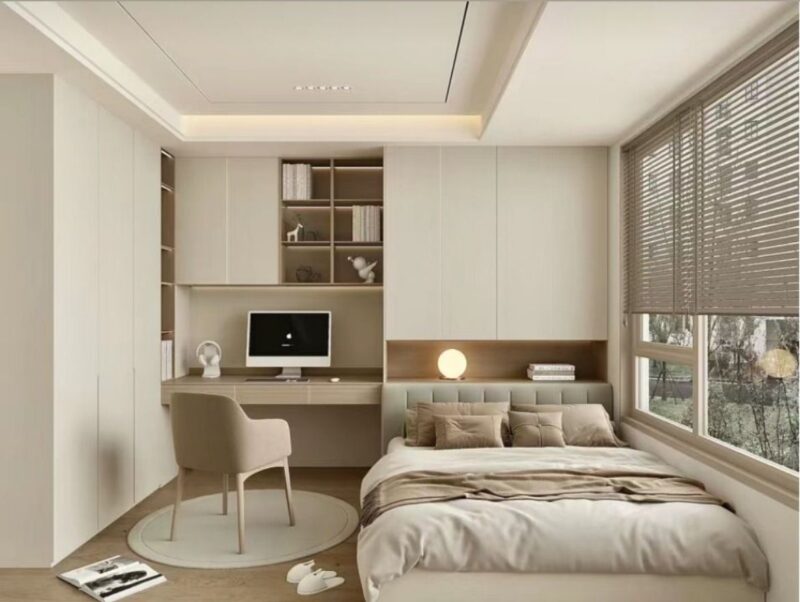 Với phòng ngủ 9m2 bạn có thẻ thoải mái đặt giường 1m6 với hai tab đầu giường nhỏ gọn. Ưu tiên tủ quần áo âm tường hoặc tủ cao kịch trần cánh lùa để tối ưu hoá không gian lưu trữ và bề mặt sàn nhà. Bố trí bàn làm việc sát cạnh cửa sổ để tận dụng ánh sáng tự nhiên và sử dụng kệ nổi treo tường thay cho giá sách. Sử dụng các gam màu trung tính kết hợp với các điểm nhấn màu trầm và ánh sáng phân lớp để tạo chiều sâu và ấm cúng cho căn phòng.