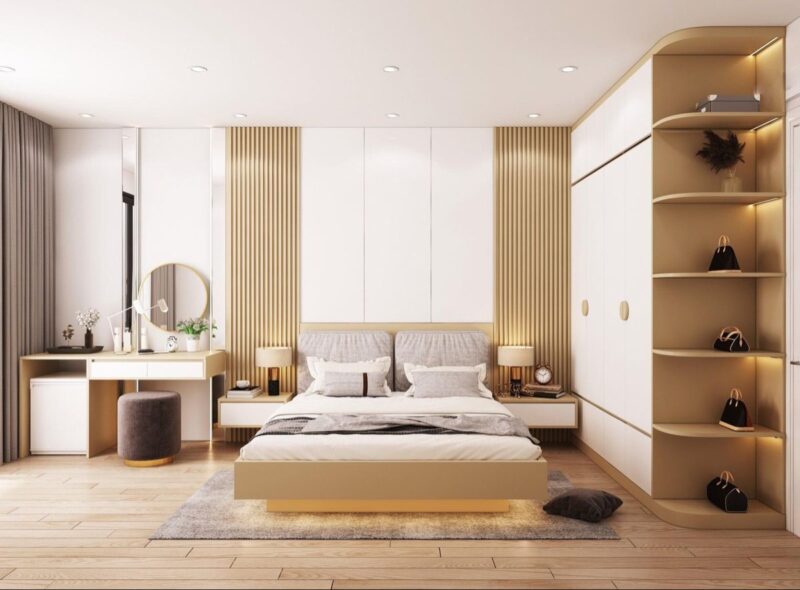 Phòng ngủ cho vợ chồng trẻ cần sự lãng mạng, hiện đại nhưng vẫn đảm bảo tính tiện nghi và linh hoạt cho cả hai. Ưu tiên phong cách Bắc Âu, hiện đại và tối giản. Sử dụng gam màu ấm áp như be, kem, xám nhạt hoặc kết hợp với gỗ tự nhiên. Nên ưu tiên giường 1m8 nên với tủ quần áo cao kịch trần và bàn làm việc đôi hoặc khu trang điểm gọn gàng.