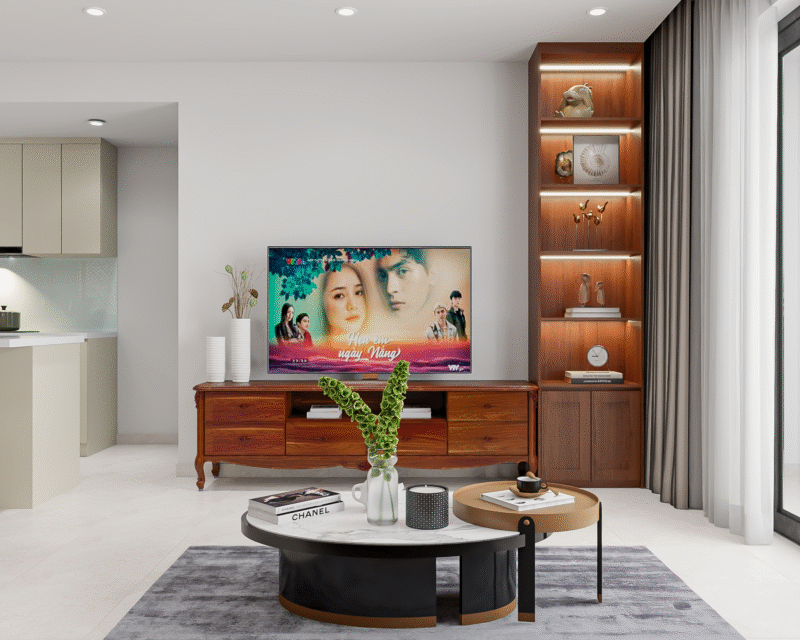 Mẫu phòng khách mang đến sự cân bằng hoàn hảo giữa tính thẩm mỹ hiện đại và cảm giác ấm cúng. Mẫu phòng khách này ưu tiên vật liệu từ thiên nhiên như gỗ sáng màu kết hợp với vải dệt thô, len và lông thú. Màu sắc nền thường là màu trắng hoặc xám nhạt làm nổi bật ánh sáng tự nhiên. Phong cách này không chỉ đẹp mà còn tạo ra không gian thư giãn, gần gũi lý tưởng cho các gia đình trẻ.