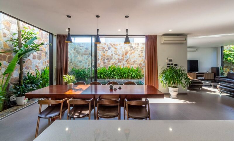 Mẫu thiết kế phòng khách này tận dụng ánh sáng tự nhiên và thông gió tạo cảm giác thoáng đãng dễ chịu như đang ở ngoài trời. Sự dụng các vật liệu tự nhiên như gỗ, đá, mây tre và các tông màu xanh lá, nâu đất, kem và trắng mang lại cảm giác hài hoà cho không gian sống. Các cây xanh và tiểu cảnh được bố trí hài hoà mang lại không khí trong lành và năng lượng tích cực giúp con người kết nối với thiên nhiên giảm căng thẳng và tăng cường sự thư giãn.