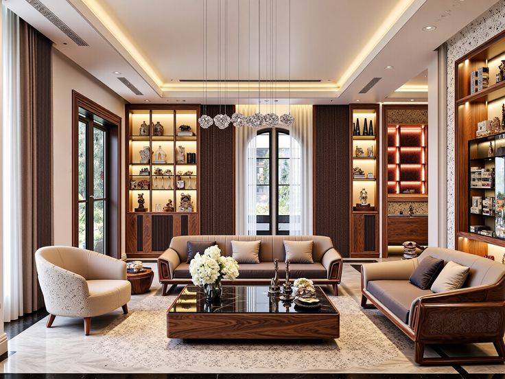 Phòng khách tân cổ điển là sự kết hợp hài hoà giữ vẻ đẹp cổ điển quý phái và tinh thần hiện đại, tinh tế. Phong cách này nhấn mạnh vào các chi tiết tối giản, đối xứng sử dụng các món nội thất cao cấp, sang trọng và quý tộc với màu sắc nhã nhặn tạo nên không gian sống đẳng cấp và vượt thời gian. Ưu tiên các tông màu trung tính và sang trọng như trắng kem, be, xám nhạt kết hợp với các điểm nhấn màu vàng đồng, bạc, hoặc xanh ngọc/xanh navy.