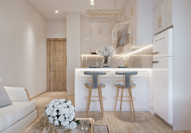 Bếp chữ I hay còn gọi là bếp thẳng là kiểu bố cục tối giản, trong đó toàn bộ khu vực nấu nướng, rửa và lưu trữ được đặt trong một đường thẳng duy nhất dọc theo một bức tường. Khi kết hợp với phong cách tân cổ điển bếp chữ I trở thành giải pháp hoàn hảo cho những không gian hẹp, dài hoặc những căn hộ studio cần sự gọn gàng nhưng đảm bảo tính thẩm mỹ cao. Ưu tiên các tông màu sáng, trung tính như trắng, kem, be, hoặc xám nhạt để tạo cảm giác không gian rộng rãi và thoáng đãng hơn.