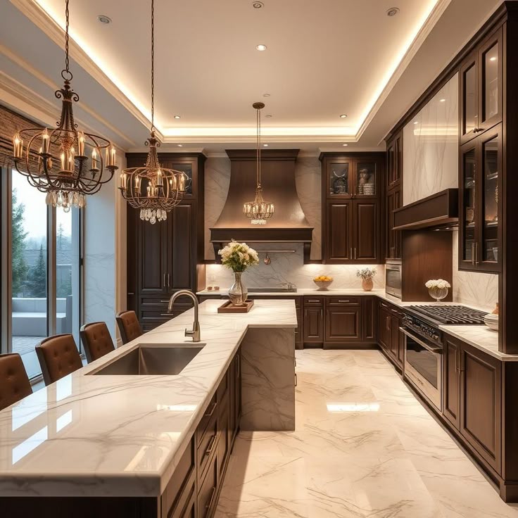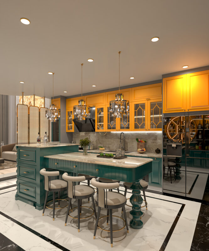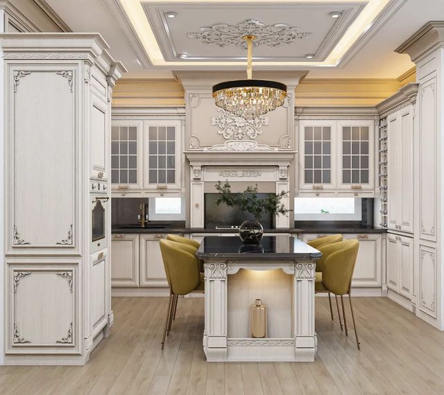 Mẫu bếp có đảo bếp là sự hoà quyện giữa vẻ đẹp vương giả và tư duy thiết kế hiện đại. Đảo bếp đóng vai trò là tâm điểm nghệ thuật vừa mở rộng không gian sơ chế vừa có thể biến tấu thành quầy bar hoặc bàn ăn tiện lợi. Sử dụng các đường phào chỉ tinh tế trên hệ tủ kết hợp cùng mặt đá sang trọng và đèn thả lung linh tạo nên một tổng thể vô cùng đẳng cấp. Đây là một thiết kế hoàn hảo để nâng tầm lối sống tạo nên sự kết nối liền mạch giữa khu vực nấu nướng và sinh hoạt chung.