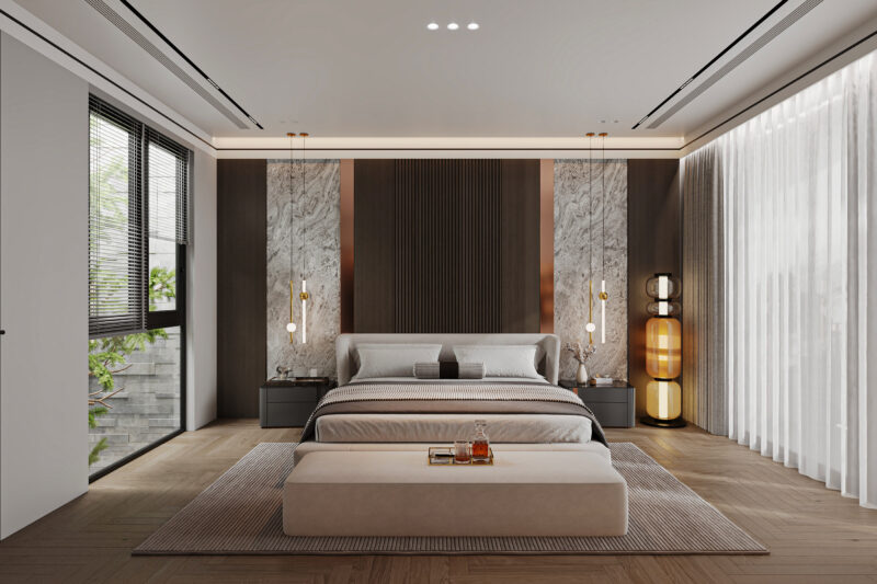 Phòng ngủ Master theo phong cách Luxury là biểu tượng của sự sang trọng, tinh tế và đẳng cấp. Sử dụng các chất liệu đắt đỏ và tinh xảo như đá marble, gỗ tự nhiên, da thật, nỉ nhung và các chi tiết kim loại mạ vàng/đồng. Ưu tiên các tông màu trung tính sang trọng kết hợp với các gam màu nhấn đậm chất hoàng gia như vàng kim, xanh sapphire hoặc vang đỏ. Giường ngủ thường có kích thước lớn với phần đầu giường bọc da/nhung cao cấp mang tính thẩm mỹ cao.