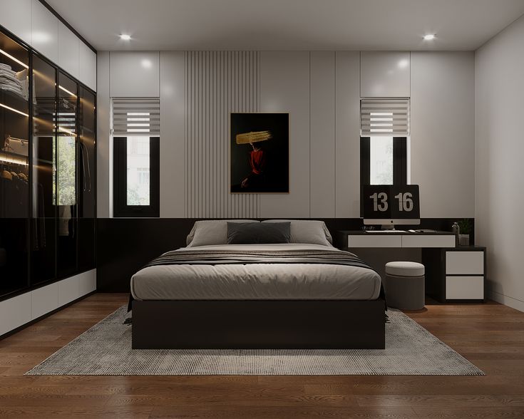 Mẫu phòng ngủ Master hiện đại tông xám mang vẻ đẹp thời thượng và chiều sâu với sự kết hợp linh hoạt các sắc độ từ xám nhạt, xám khói đến xám than trên nền các đường nét kiến trúc thẳng nét, gãy gọn. Không gian ưu tiên sử dụng vật liệu công nghiệp cao cấp như gỗ phủ laminate, vách ốp giả đá và kính màu tối, tạo nên sự phản chiếu ánh sáng tinh tế và cảm giác cực kỳ sang trọng. Điểm nhấn của căn phòng thường là hệ thống đèn LED hắt khe tường nghệ thuật cùng nội thất thông minh.