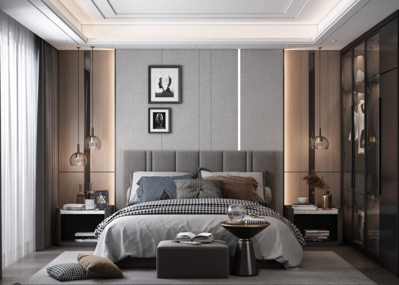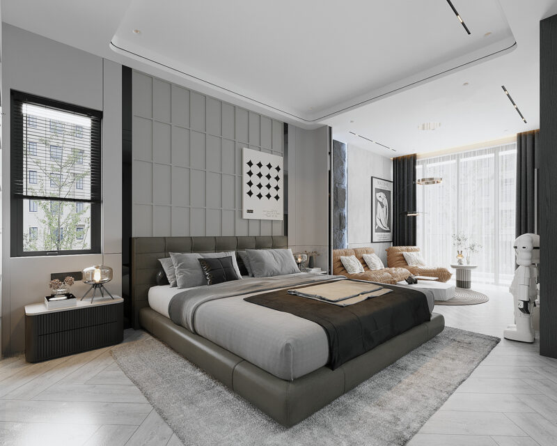 Mẫu phòng ngủ Master hiện đại với tông màu xám