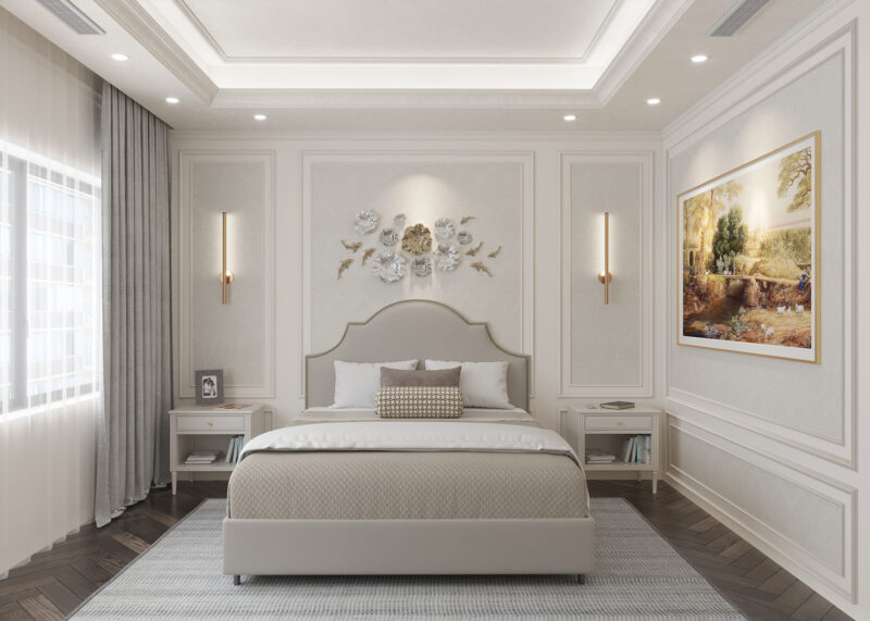 Phòng ngủ Master phong cách tân cổ điển là sự giao thoa hoàn hảo giữa nét quý tộc truyền thống và vẻ đẹp hiện đại, nổi bật với những đường phào chỉ tinh tế trên tường cùng họa tiết chạm khắc uốn lượn mềm mại. Không gian này thường sử dụng các chất liệu cao cấp như gỗ tự nhiên và vải gấm thượng hạng, kết hợp cùng tông màu hoàng gia như trắng kem hay vàng đồng để tạo nên vẻ đẹp bề thế.