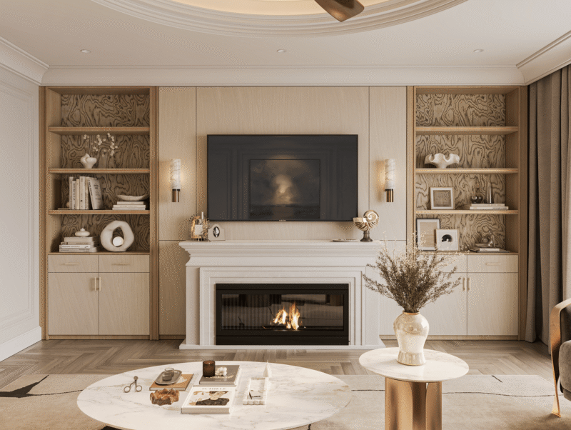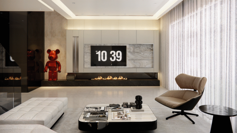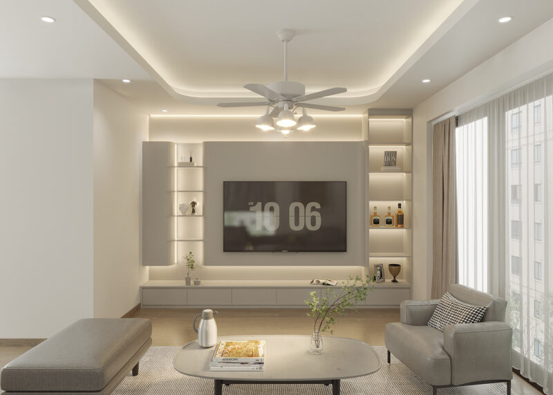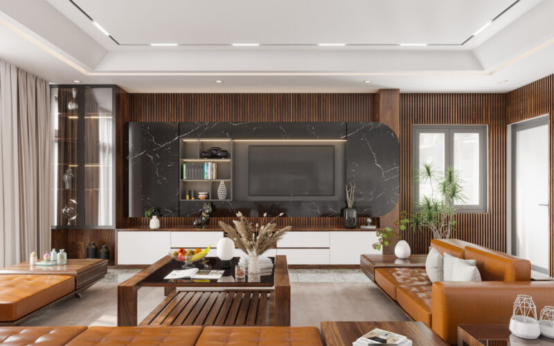 Đồ trang trí là lớp hoàn thiện cuối cùng giúp tổng thể tạo nên sức sống cho phòng khách. Bạn nên sử dụng các vật liệu có tính thẩm mỹ cao như tranh treo tường khổ lớn, đồng hồ nghệ thuật hoặc gương trang trí để tạo chiều sâu và điểm nhấn cho căn phòng. Kết hợp thêm các yếu tố tự nhiên như chậu cây xanh, bình hoa tươi sẽ giúp thanh lọc không khí và mang lại cảm giác thư thái. Để không gian thêm phần ấm cúng và tinh tế, hãy bố trí các món đồ nhỏ trên bàn trà hoặc kệ tivi như nến thơm, tượng điêu khắc mini hoặc những cuốn sách nghệ thuật.