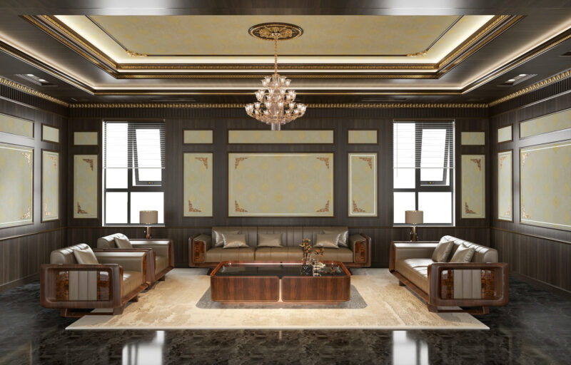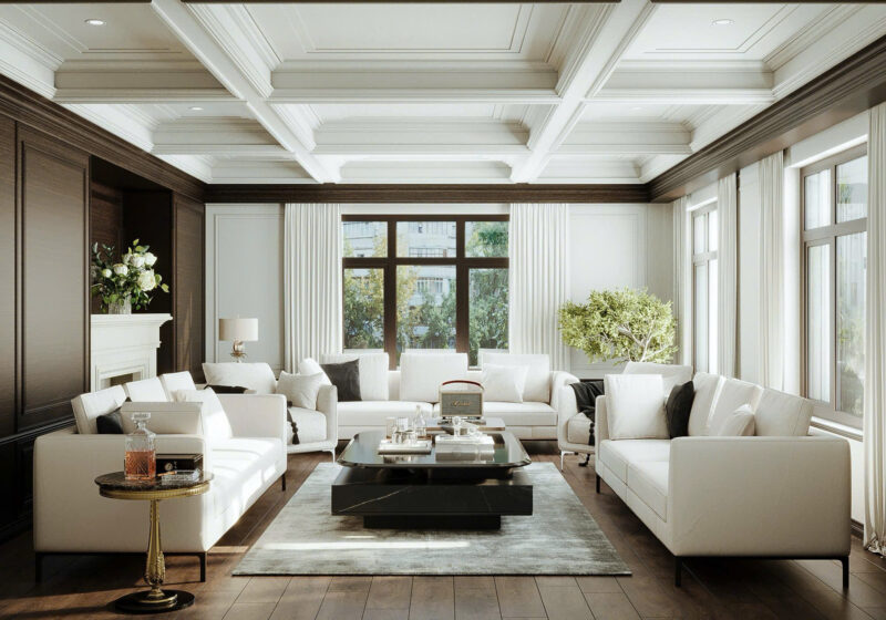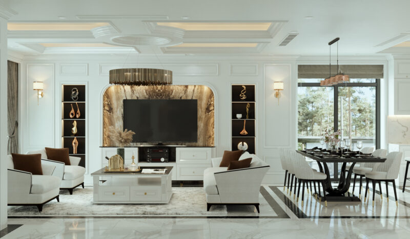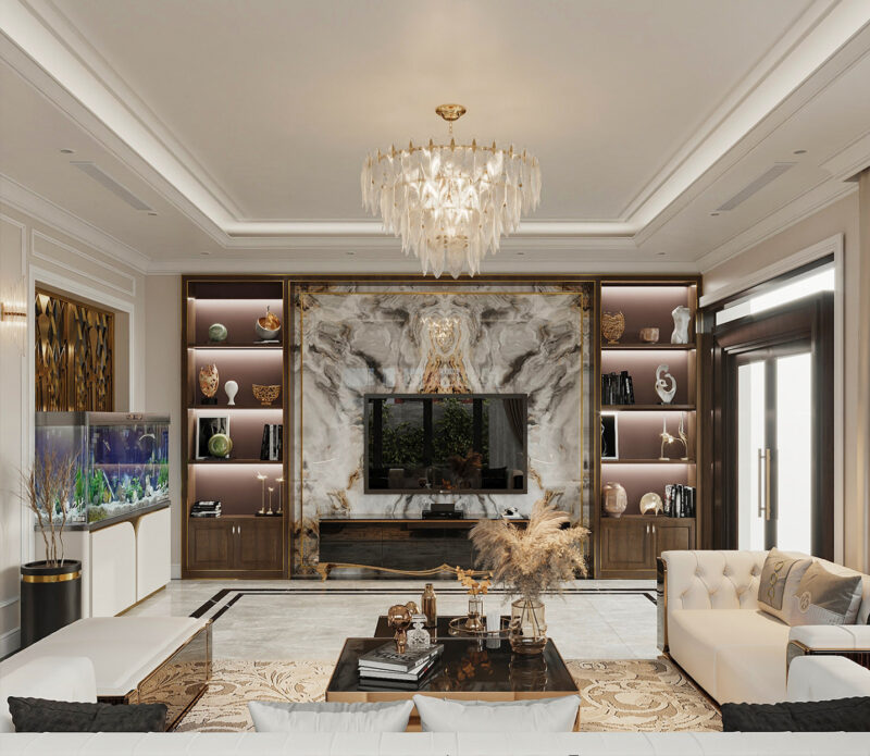 Phòng khách Tân cổ điển là biểu tượng của sự sang trọng và đẳng cấp, được lược bỏ những chi tiết rườm rà của phong cách cổ điển để phù hợp với nhịp sống hiện đại.