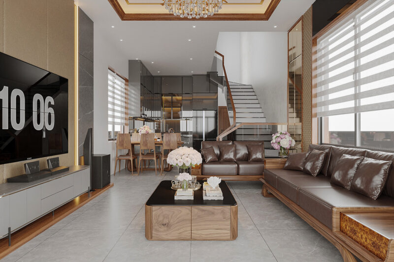 Bảng màu chủ đạo gồm trắng kem, vàng be hoặc xám chì, kết hợp cùng ánh sáng đèn chùm pha lê để tạo nên không gian tiếp khách vừa uy nghi, vừa ấm cúng. Đây là lựa chọn lý tưởng cho những gia chủ theo đuổi vẻ đẹp lịch lãm và bền vững với thời gian.