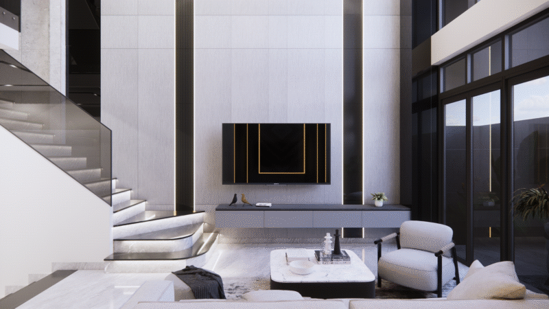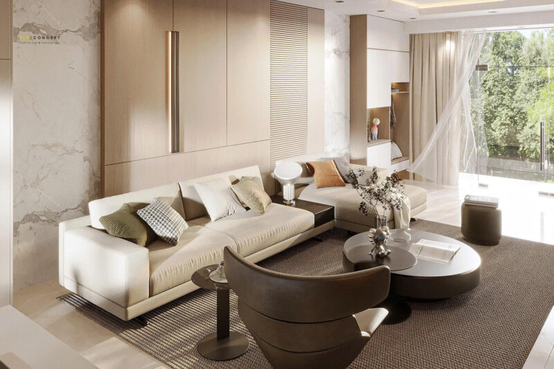 Phong cách hiện đại trong phòng khách tập trung vào ba giá trị cốt lõi: Sự đơn giản, Công năng và Không gian.