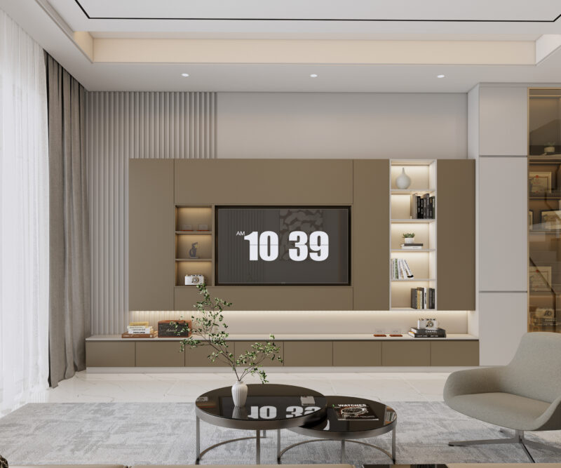 Tủ kệ tivi cần có kích thước tỷ lệ thuận với tivi và diện tích phòng, đảm bảo chiều dài kệ lớn hơn tivi để tạo sự cân đối. Về vị trí, độ cao của kệ phải được tính toán sao cho tâm màn hình ngang tầm mắt người ngồi nhằm bảo vệ sức khỏe mắt. Với không gian nhỏ, kệ tivi treo tường hoặc thiết kế tối giản là lựa chọn tối ưu để giải phóng mặt sàn, trong khi phòng rộng có thể sử dụng hệ tủ kịch trần kết hợp trang trí để tạo sự sang trọng.