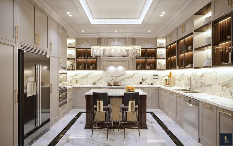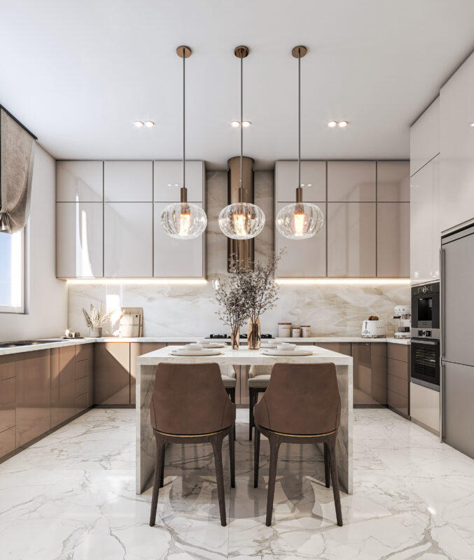 - Bố trí ánh sáng chuyên biệt: Đừng chỉ phụ thuộc vào ánh sáng chung của cả căn phòng. Một bộ đèn thả trần (thường là 2 hoặc 3 chiếc) đặt ngay phía trên đảo bếp không chỉ cung cấp đủ ánh sáng tập trung cho việc nấu nướng mà còn là điểm nhấn thẩm mỹ cực kỳ quan trọng, giúp không gian bếp trở nên sang trọng và ấm cúng hơn vào buổi tối.