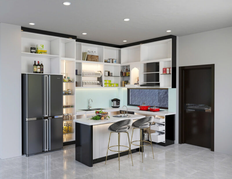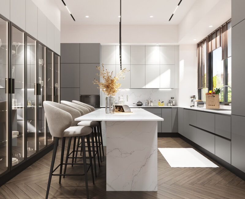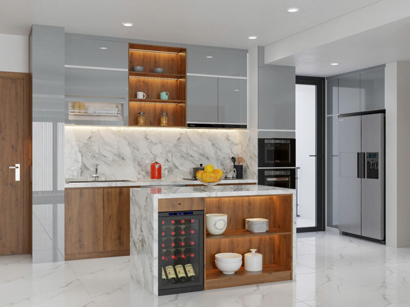 - Chiều cao phù hợp với mục đích sử dụng: Thông thường, đảo bếp sẽ có chiều cao bằng với mặt bếp chính (khoảng 81cm – 86cm) để tạo sự đồng nhất và thuận tiện cho việc sơ chế.