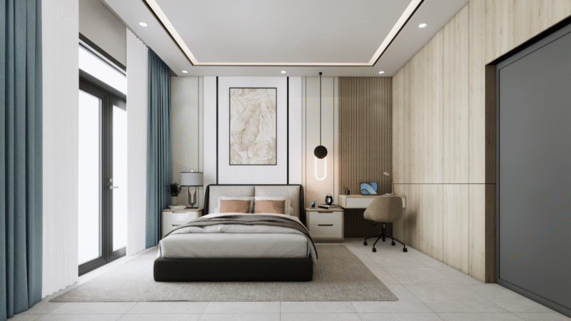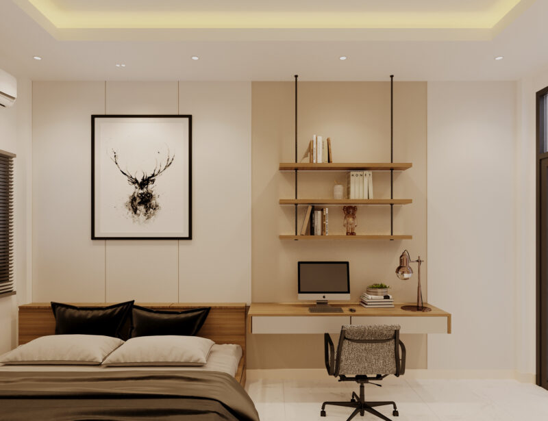 Phân chia khu vực hợp lý: Nếu phòng ngủ tích hợp góc làm việc, hãy sử dụng đồ decor (như thảm hoặc kệ sách) để phân tách rõ ranh giới, giúp não bộ tách biệt được không gian nghỉ ngơi và không gian áp lực.