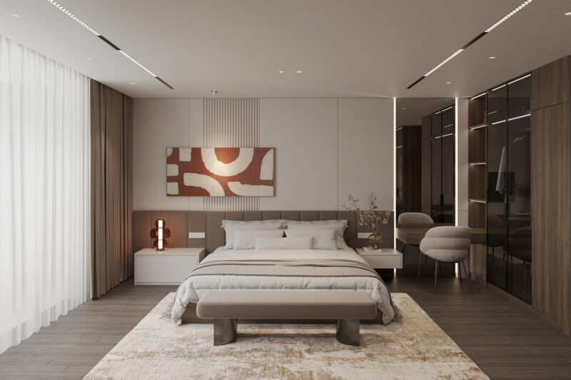 Đừng để những bức tường trở nên trống rỗng. Một bộ tranh trừu tượng hoặc tranh phong cảnh tone màu trung tính sẽ là điểm nhấn thị giác tuyệt vời, thể hiện gu thẩm mỹ tinh tế của chủ nhân.