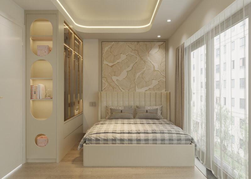 Ưu tiên màu sắc trung tính: Nên chọn tông màu chủ đạo là các sắc thái nhẹ nhàng như trắng, kem, xám nhạt hoặc xanh pastel. Những màu sắc này giúp xoa dịu thị giác, tạo cảm giác thư giãn và giúp giấc ngủ đến nhanh hơn so với các tông màu quá rực rỡ.