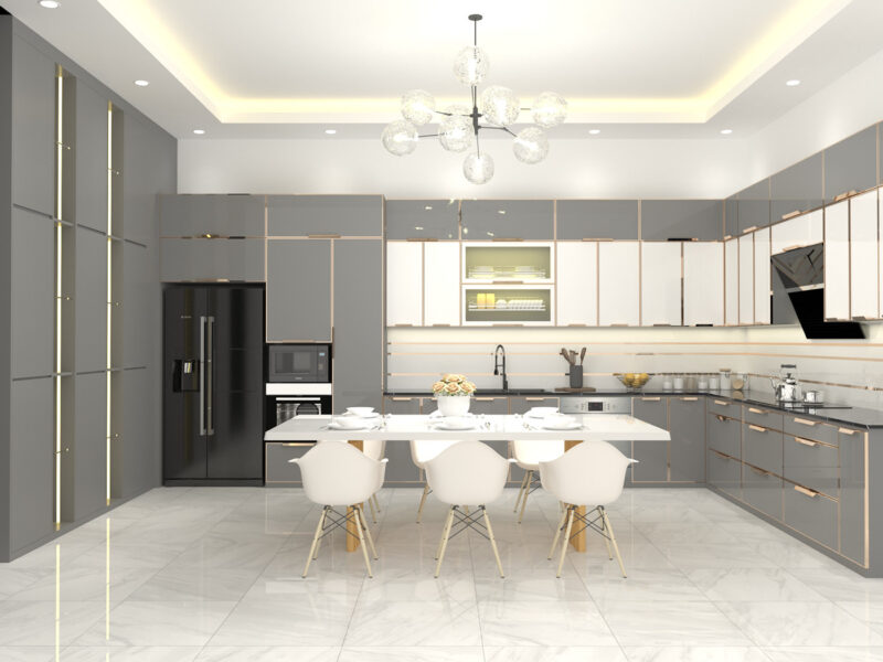 Tủ bếp chữ L tối giản hiện đại tập trung vào sự tinh gọn bằng cách lượt bỏ các chi tiết rườm rà, thay thế tay nắm truyền thống bằng hệ cách phẳng vát cạnh hoặc nhấn mở thông minh. Thiết kế này thường ưu tiên các tông màu trung tính như trắng, xám hoặc đen kết hợp cùng các bề mặt phẳng mịn của gỗ công nghiệp để tạo cảm giác không gian rộng rãi và liền mạch. Điểm nhấn của phong cách này nằm ở cách bố trí thiết bị âm tủ ngăn nắp và hệ thống ánh sáng tinh tế, không chỉ tối ưu hóa công năng sử dụng mà còn mang lại vẻ đẹp thanh lịch, sang trọng cho căn bếp hiện đại.