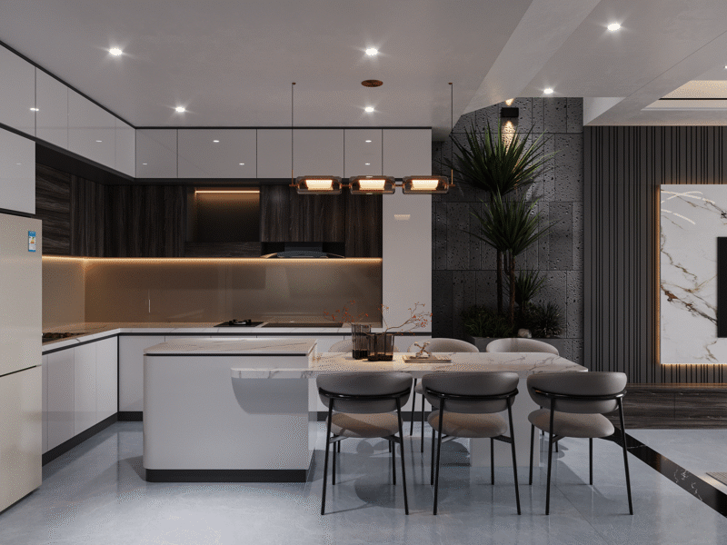 Bếp chữ L theo tông màu đen trắng là sự kết hợp kinh điển mang lại vẻ đẹp tương phản mạnh mẽ tạo nên không gian nấu nướng cực kỳ sang trọng và hiện đại. Thiết kế này thường sử dụng tủ trên màu trắng để tạo cảm giác thoáng đãng kết hợp với tủ dưới màu đen giúp che giấu vết bẩn và tạo sự vững chãi cho hệ tủ. Việc phối hợp thêm các phụ kiện kim loại, mặt đá vân mây hoặc kính ốp bếp đen bóng không chỉ làm nổi bật cá tính của gia chủ mà giúp căn bếp luôn giữ được vẻ sạch sẽ, ngăn nắp và không bao giờ bị lỗi mốt.
