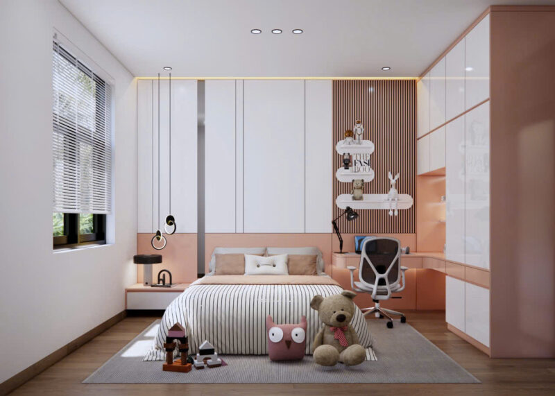 Phòng ngủ 10m2 cho bé gái nên ưu tiên các gam màu nhẹ nhàng như hồng pastel, tím nhạt hoặc trắng kem để tạo nên một không gian ngọt ngào và thơ mộng. Việc sử dụng giường bục thông minh tích hợp tủ quần áo kịch trần không chỉ giúp tối ưu diện tích lưu trữ váy áo mà còn dành ra khoảng trống thoáng đãng để bé bày biện góc học tập hay khu vực vui chơi sáng tạo.