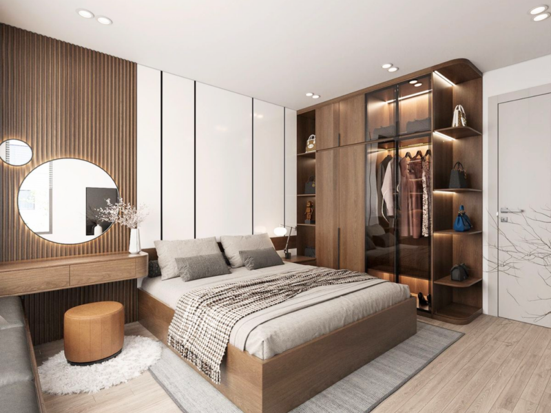 - Bố trí nội thất tối giản: Giường ngủ kích thước vừa phải, tủ quần áo âm tường hoặc tủ cao sát trần giúp tiết kiệm diện tích sàn.