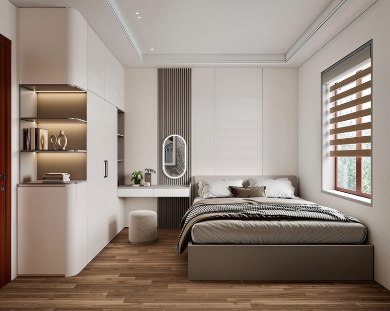 Thiết kế ưu tiên giường vừa phải, tủ quần áo đủ dùng và không gian lưu trữ thông minh. Sự tối giản này giúp phòng dễ thay đổi khi nhu cầu sinh hoạt tăng lên.