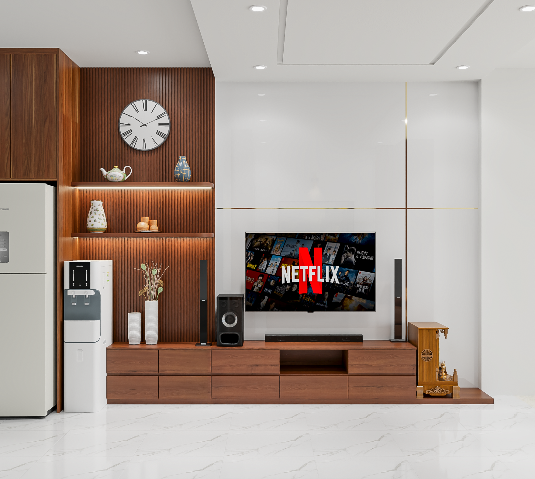 - Không gian phòng khách tích hợp giải trí với không gian thông minh: Trung tâm của phòng khách là màn hình tivi lớn, được đặt cố định trên tường cùng hệ thống loa stereo giúp gia đình thưởng thức các bộ phim, chương trình giải trí như Netflix một cách thoải mái. Kệ tủ đa năng dưới tivi giúp lưu trữ các thiết bị điện tử, sách vở hay đồ trang trí nhỏ xinh.