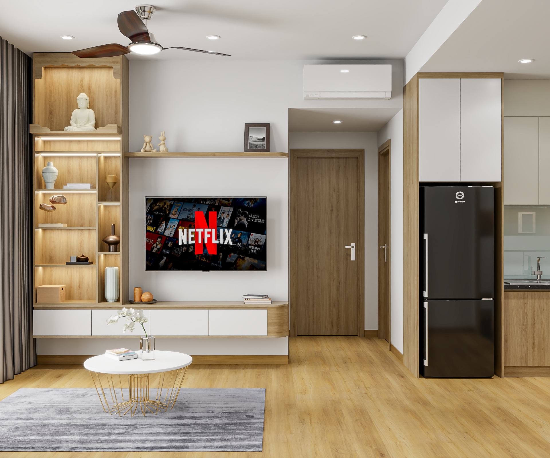 - Màn hình TV lớn đặt ngay trung tâm, dễ dàng tiếp cận và phù hợp cho giải trí cùng gia đình. Không gian còn điểm xuyến bằng các vật trang trí nhỏ gọn, như bình hoa, sách và tượng nhỏ tạo sự sinh động và cá tính cho căn phòng. Tủ lạnh và các thiết bị trong bếp gần kề, thể hiện sự tiện nghi và hợp lý trong bố trí không gian mở.