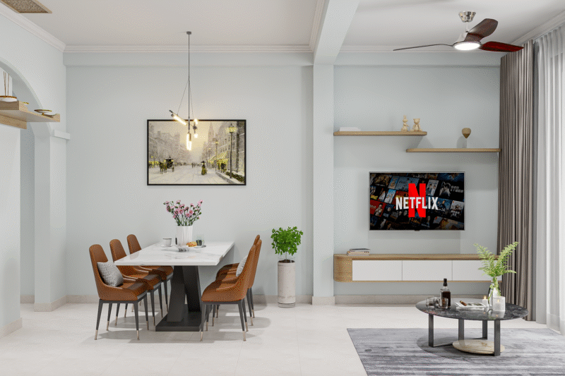- Phòng khách gọn gàng với tivi treo tường tích hợp kệ lưu trữ màu gỗ tự nhiên, tạo cảm giác gần gũi và dễ chịu.