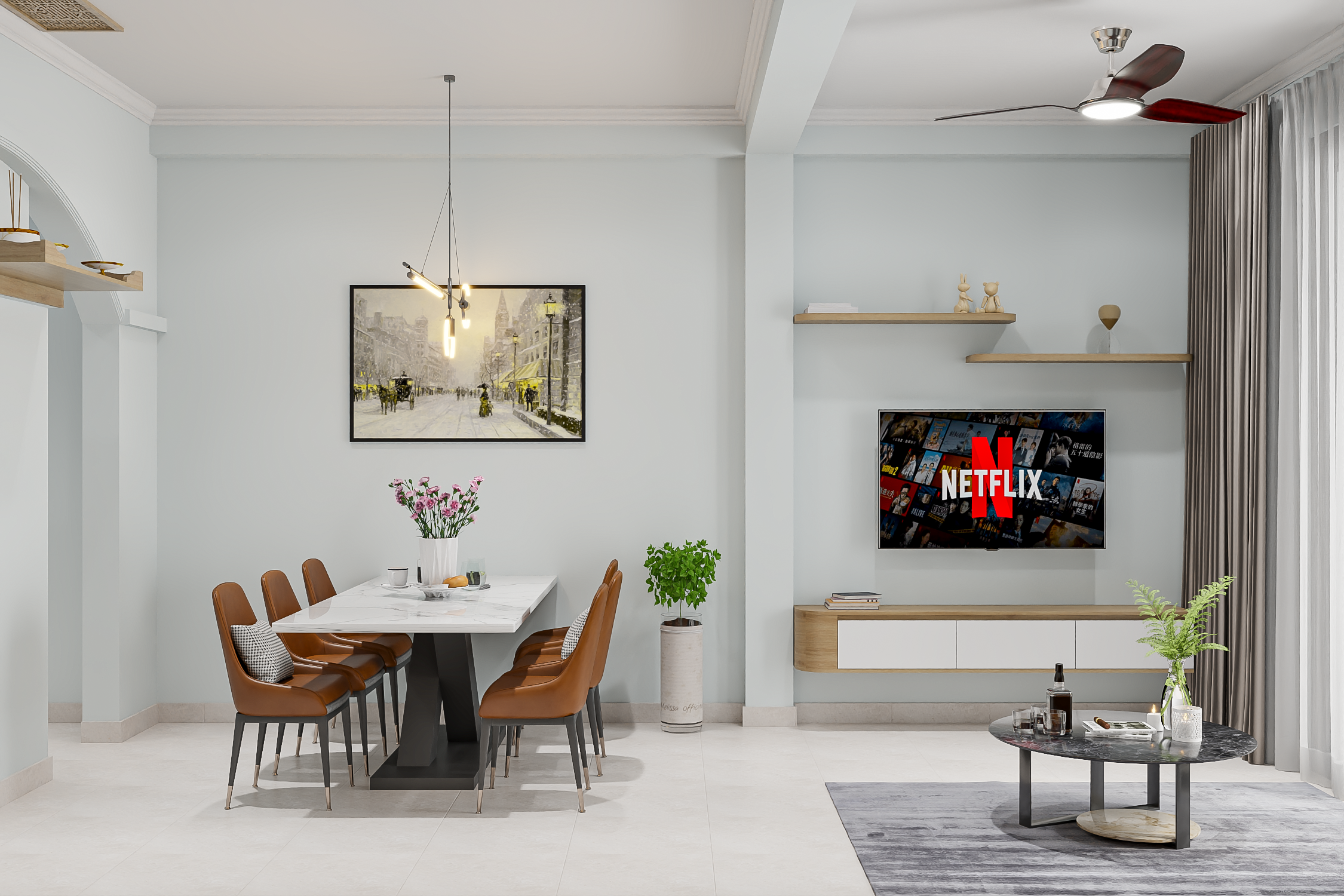 - Điểm nhấn của không gian là cây xanh để bàn và chậu cây lớn, mang lại sự tươi mát, trong lành cho căn nhà. Trần nhà trang trí với quạt trần hiện đại, góp phần điều hòa không khí, tạo cảm giác dễ chịu trong từng khoảnh khắc sinh hoạt.
