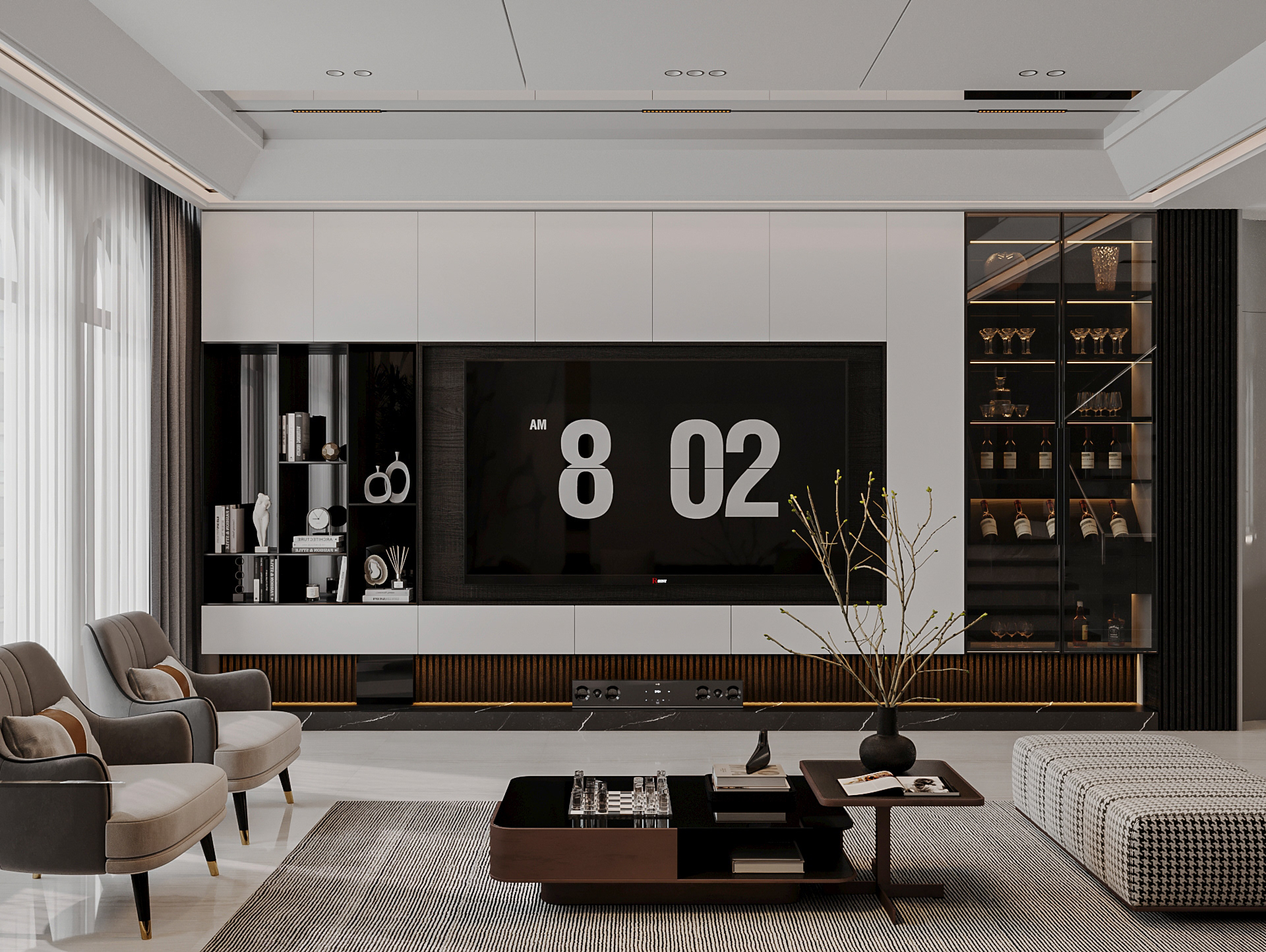 - Khu vực ốp tivi và tủ trang trí: Sử dụng cốt gỗ MDF với lớp phủ laminate vân gỗ sẫm màu giúp tạo chiều sâu và độ tương phản mạnh mẽ với hệ tủ màu trắng bên trên