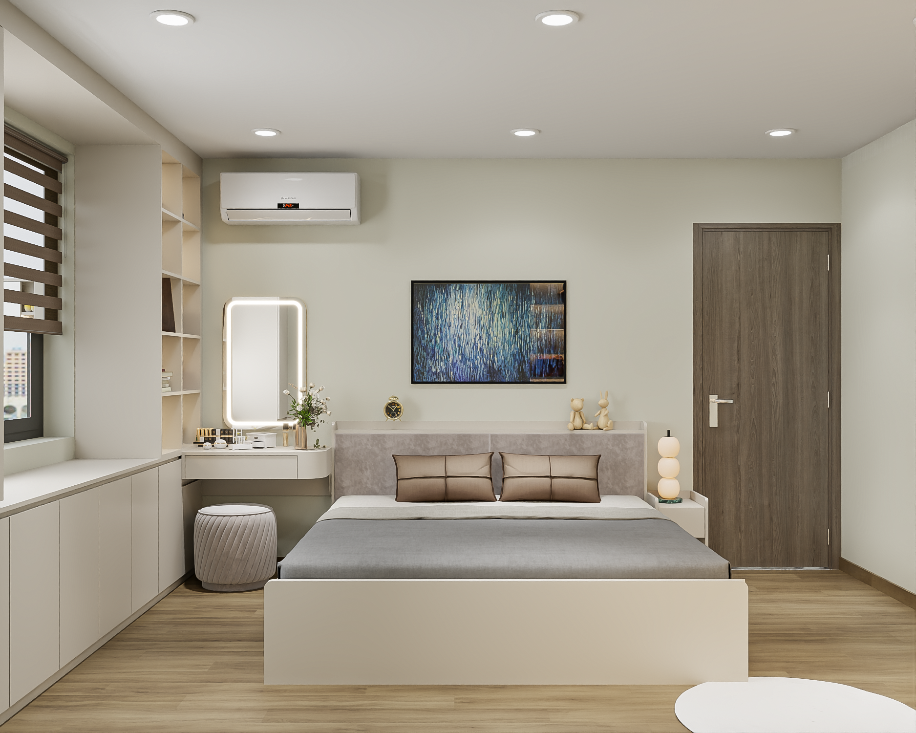 - Bộ phòng ngủ với tủ quần áo được thiết kế tích hợp phía bên trái của phòng, dài và thấp, với các cánh cửa dạng mở hoặc lắp đặt âm tường mang phong cách tối giản.