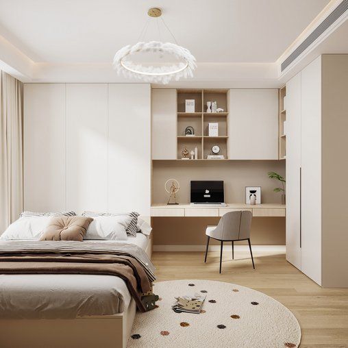 - Phòng sử dụng tông màu chủ đạo trắng – be – gỗ sáng, giúp không gian rộng rãi và thoáng đãng hơn. Chiếc giường đôi được bố trí gọn gàng cạnh cửa sổ, kết hợp với bàn làm việc tích hợp kệ tủ âm tường, vừa tiết kiệm diện tích vừa mang lại sự tiện lợi cho sinh hoạt hằng ngày.