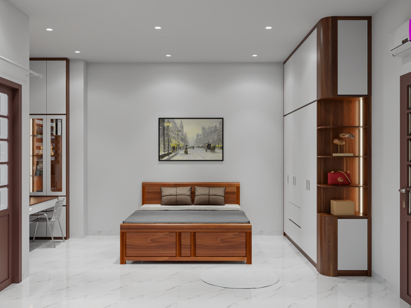 - Phòng ngủ được thiết kế theo tông màu trung tính như trắng, nâu gỗ tự nhiên, kết hợp hài hòa giữa các yếu tố gỗ tự nhiên và màu sắc sáng tối nhẹ nhàng.