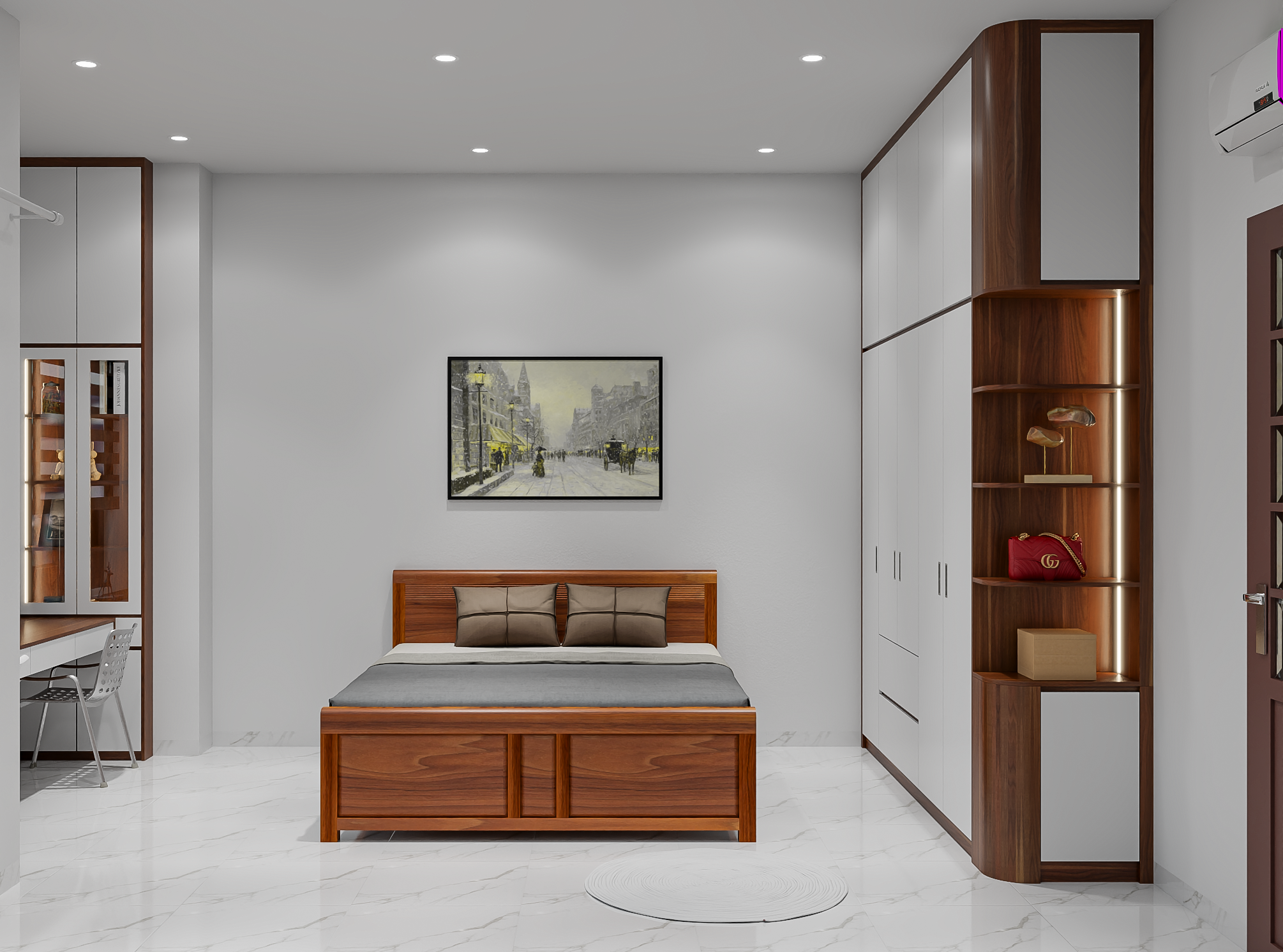 - Hệ tủ quần áo âm tường với cánh cửa trơn màu trắng, giúp mở rộng không gian và giữ cho phòng luôn gọn gàng, ngăn nắp.
