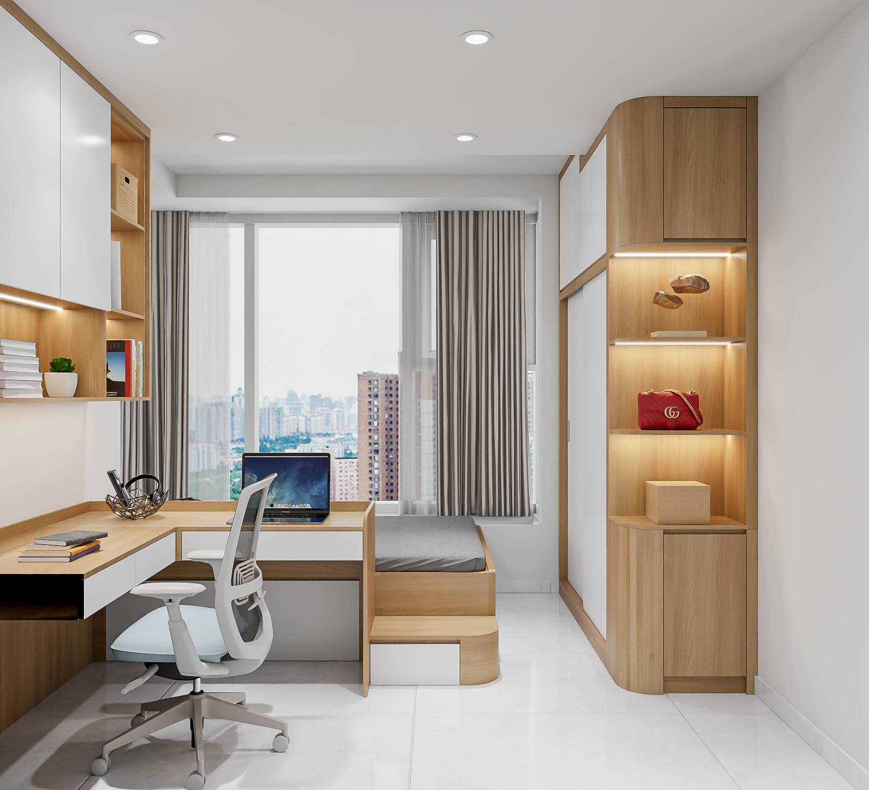- Màu sắc hiện đại, sang trọng: Phòng ngủ sử dụng tone gỗ sáng + trắng chủ đạo, tạo cảm giác trẻ trung, sạch sẽ và tăng hiệu ứng mở rộng cho không gian nhỏ.