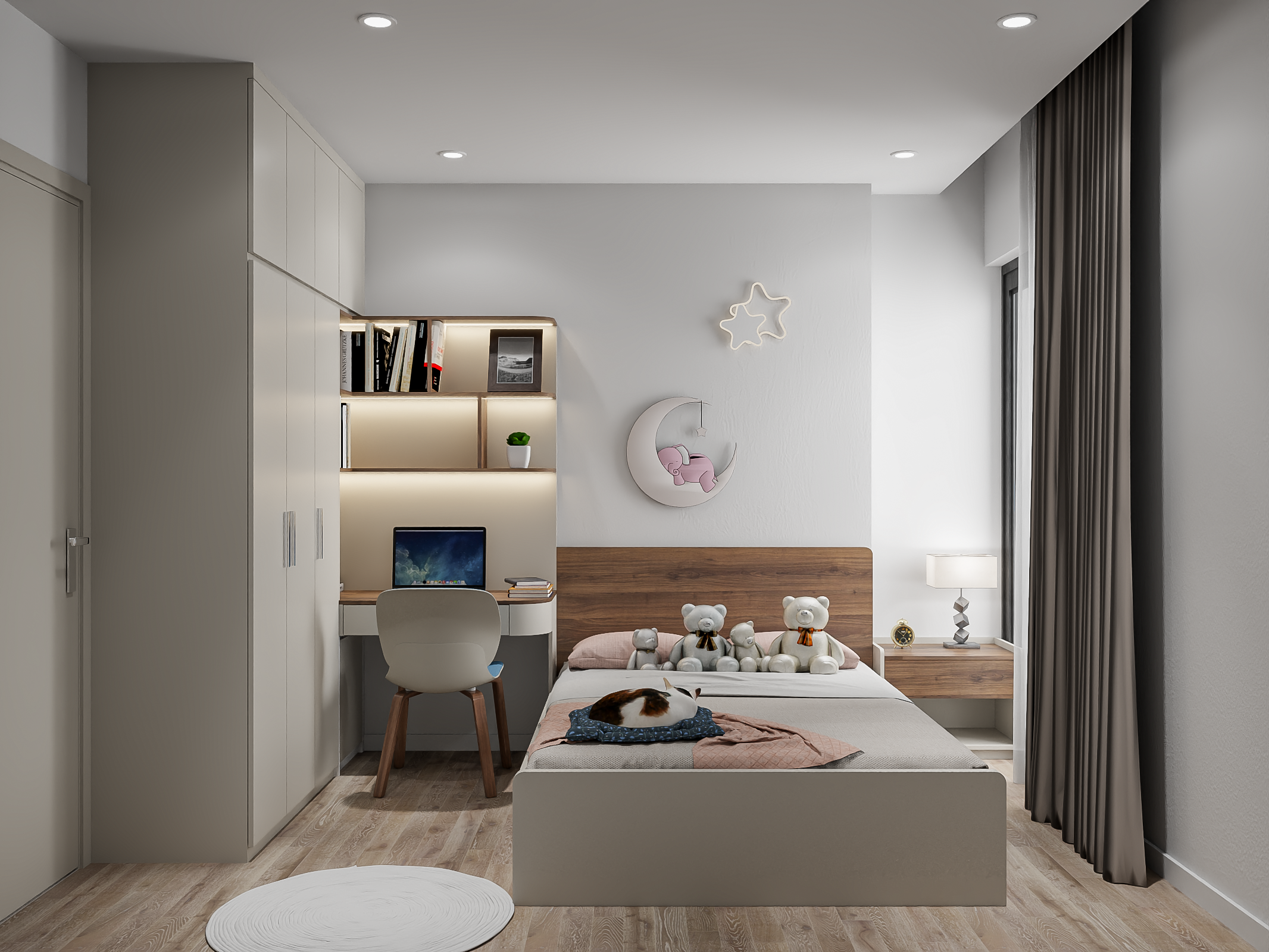 - Tổng thể, không gian bộ phòng ngủ này hướng đến sự tiện nghi, thoải mái và thẩm mỹ, phù hợp cho các bé hoặc các bạn trẻ yêu thích phong cách hiện đại, dễ thương và tinh tế.