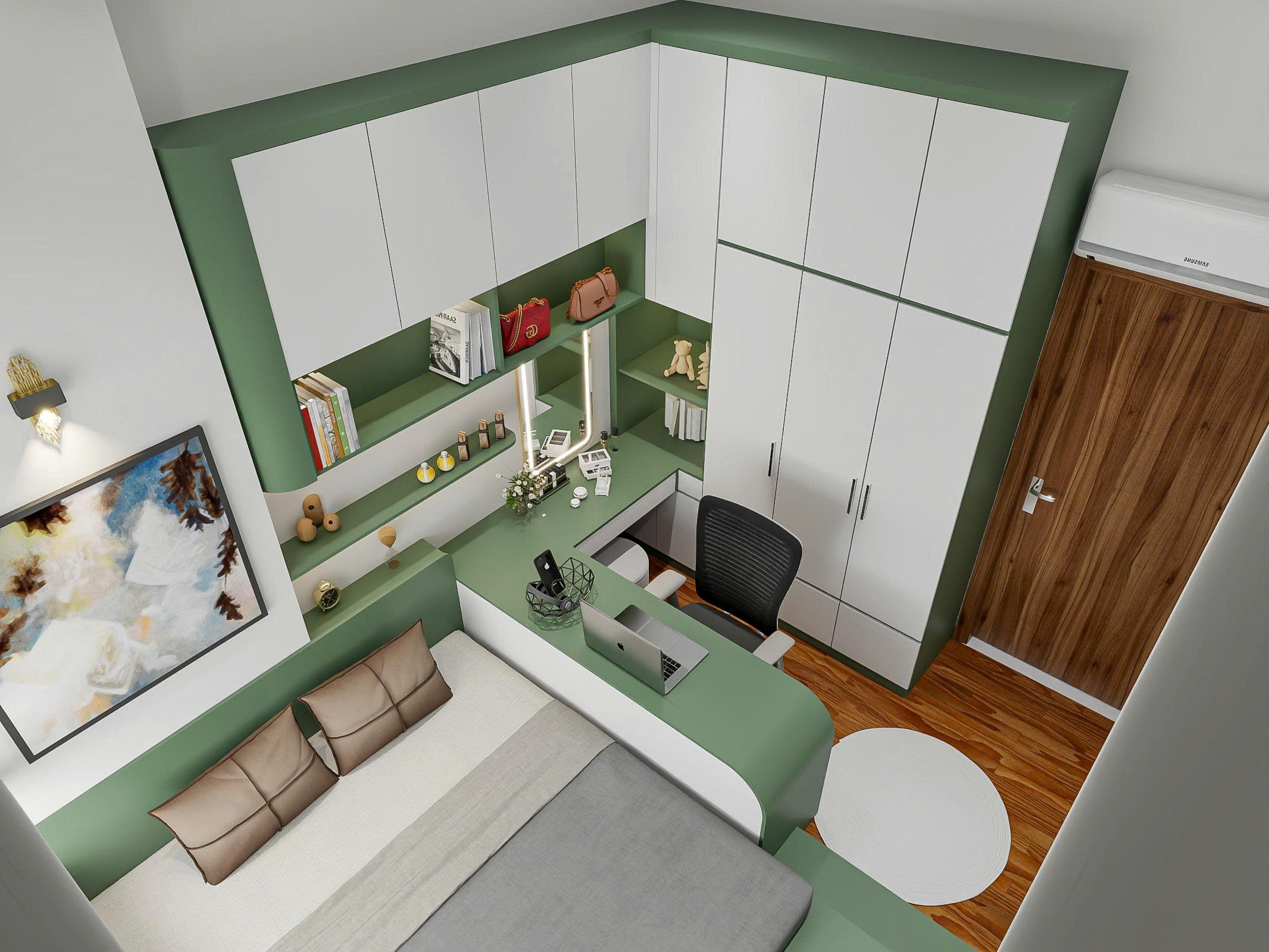 - Không gian được sắp xếp gọn gàng, với giường ngủ đặt sát tường để mở rộng lối di chuyển.