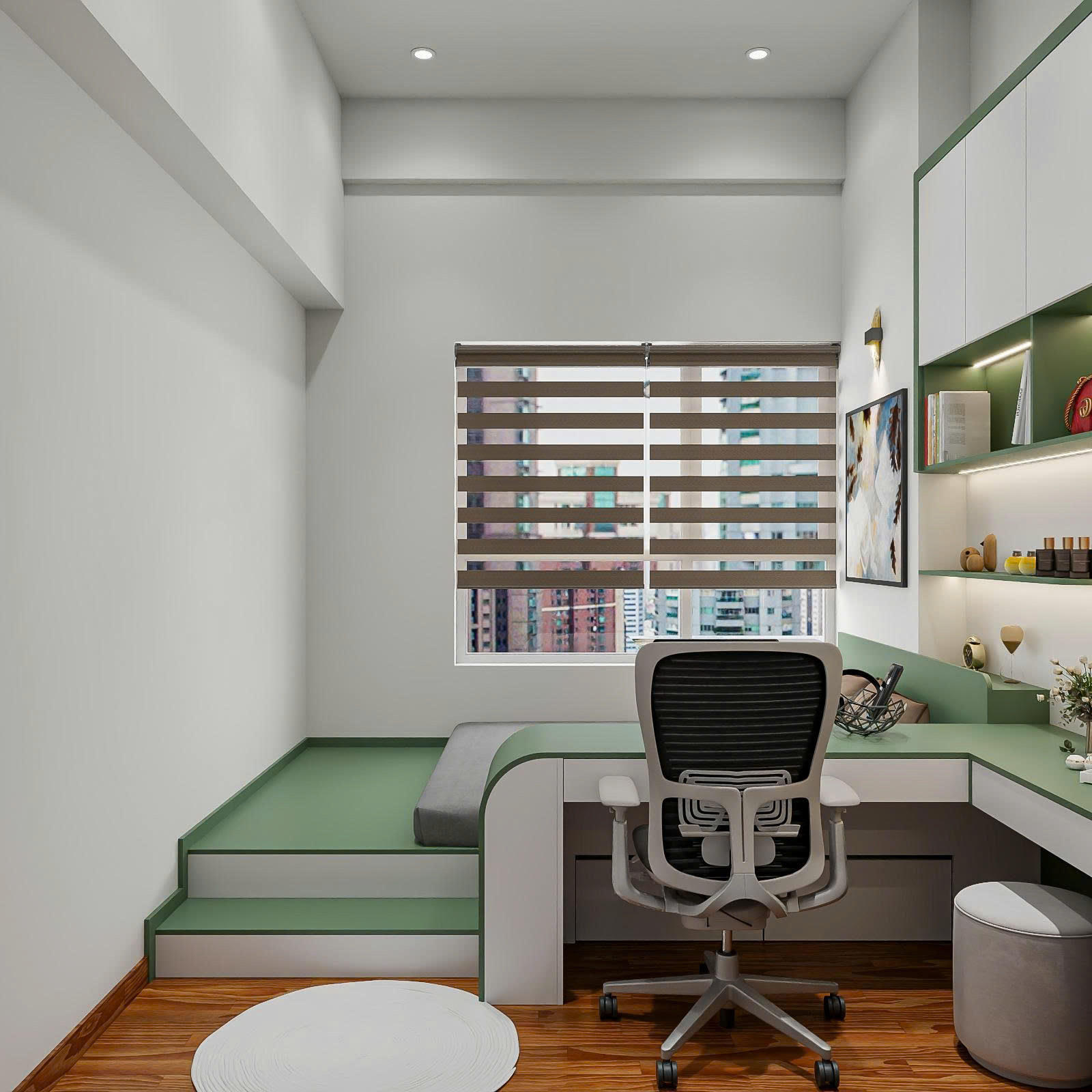 - Không gian phòng ngủ được bố trí thêm bàn làm việc và ghế ngồi tiện nghi, mang lại cảm giác thoải mái và linh hoạt trong sinh hoạt hằng ngày. Dù diện tích chỉ 8m², căn phòng vẫn đảm bảo đủ công năng cho cả nghỉ ngơi và làm việc.