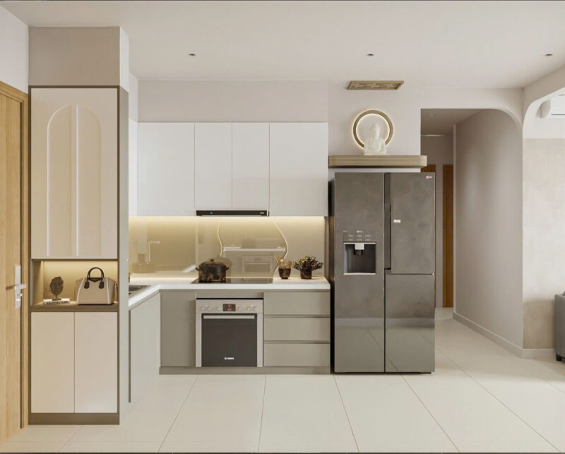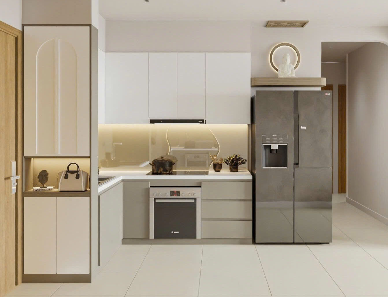 - Không gian sử dụng tông màu trung tính chủ đạo – trắng, be và nâu gỗ, tạo cảm giác ấm áp nhưng vẫn hiện đại. Ánh sáng tự nhiên từ cửa sổ kết hợp đèn trần giúp khu vực nấu nướng luôn thoáng sáng và dễ chịu.