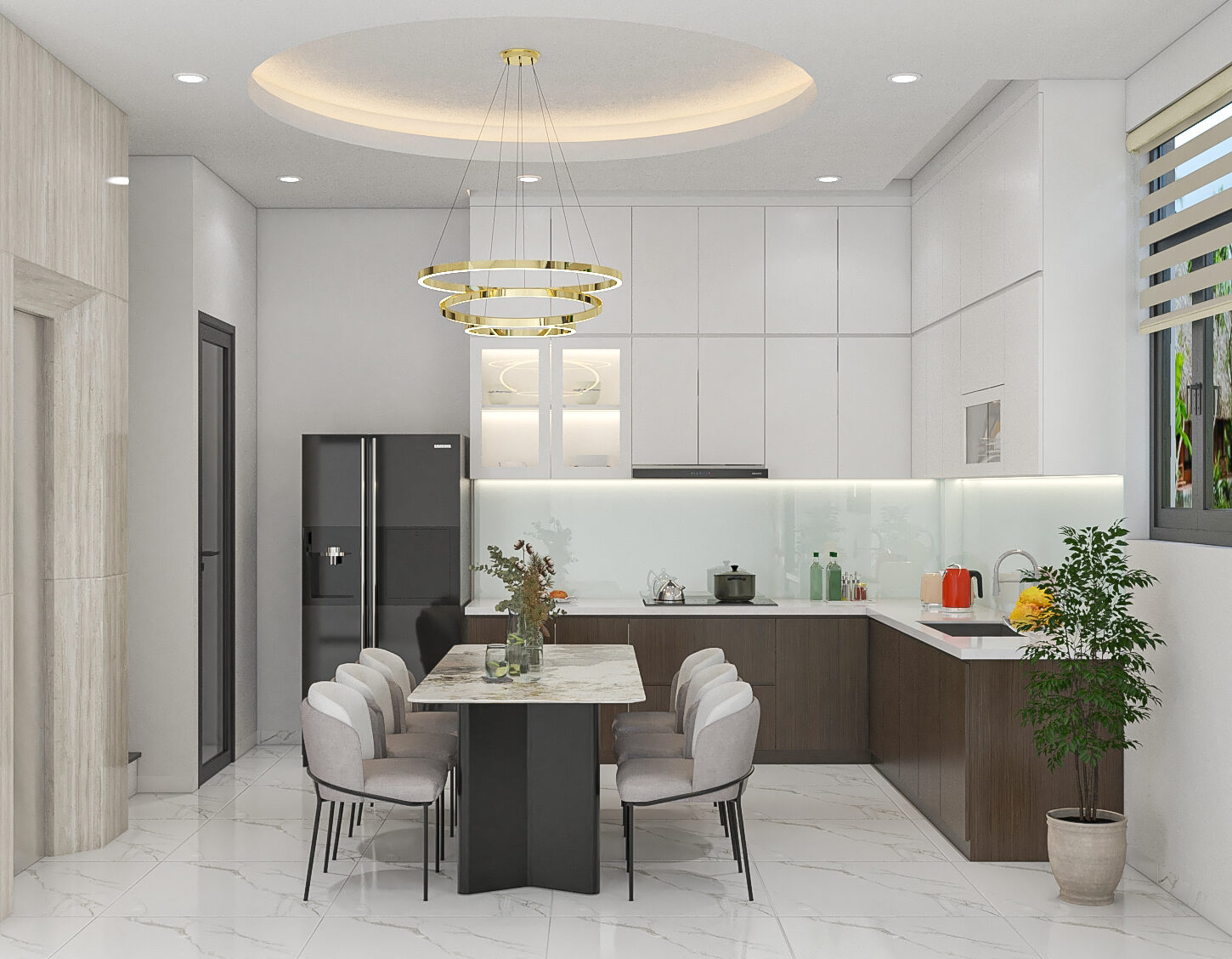 - Mẫu thiết kế phòng bếp này mang phong cách hiện đại, tiện nghi cho gia đình trẻ: Mẫu thiết kế phòng bếp dưới đây nổi bật với phong cách hiện đại – tối giản, mang lại sự tinh tế và tiện nghi cho mọi gia đình. Không gian được tối ưu về ánh sáng, màu sắc và công năng, phù hợp với các căn hộ, nhà phố hoặc biệt thự mini.